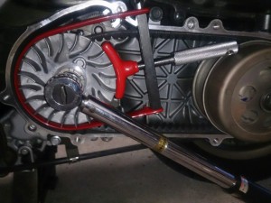 プーリーホルダーでプーリーフェイスに固定し、プーリーフェイスを外します。ソケットは17mmです。