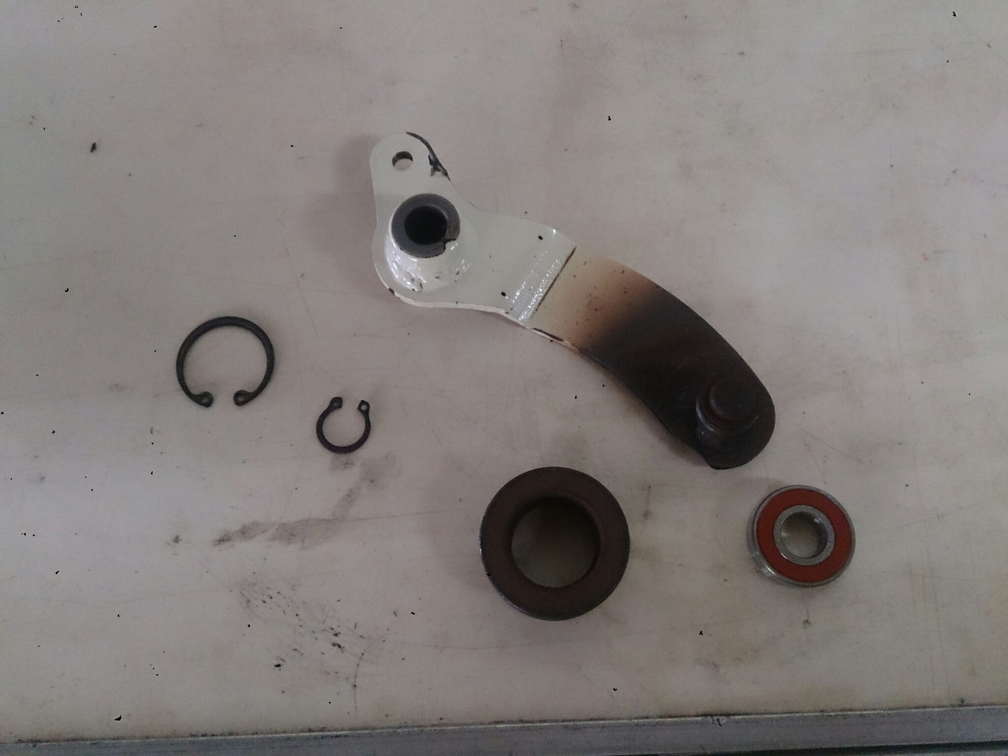 仕方が無いので、テンショナーとスナップリングは今あるものを再利用しなければなりません。ベルトの当たり面を耐水ペーパーで表面のベルト焼きが無くなるまでしこたま磨きました。ベアリングは、とりあえず内径と外径が同じ違う機種のもので何とかしました。