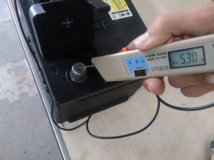 お預かり時の電圧は「5.30V」、当然のことながらインジケーターも要充電の表示で、昨日より低電流でアンメーターの触れ具合を見ながら充電作業を続けています。この様子ですと今晩中にはインジケーター(比重)も回復してくるかと思いますので、休み明けの8/3日にはお客様に充電作業完了とテスト結果のご報告が出来ます。