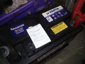 運転席足元のOBDⅡコネクターでバックアップ電源に繋ぎ、A/Cダストフィルターボックスを取り外し、バッテリー交換作業をしてまいります。詳しい交換方法、手順については公式サイトの ベンツ W212のバッテリー交換方法 をご参照くださいませ。