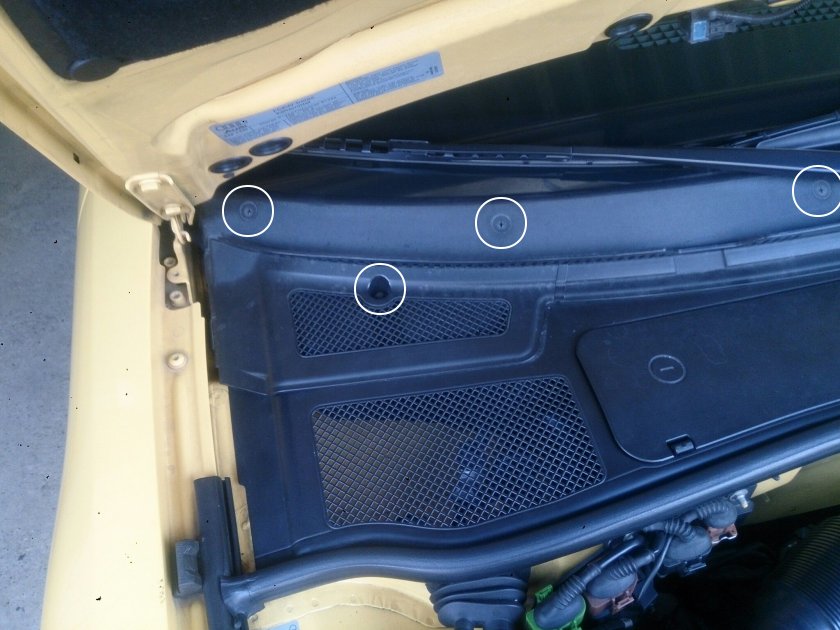 次に、画像のワイパー下のプレートを外します。プラスネジ(3箇所)は緩める方向(左回転)に90度回してやり、A/Cのダストフィルターのボルトは8mmです。