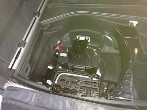 近年のアウディ(アイドリングストップ機能装着モデル)は、A1~A8まで全てバッテリーはトランクルームのフロア内に搭載されますので、先ずOBDⅡコネクターでバックアップを取ったらバッテリー本体にアクセス出来るようにフロアカバーや車載工具など、余計なものを全て車から降ろすことからはじめます。