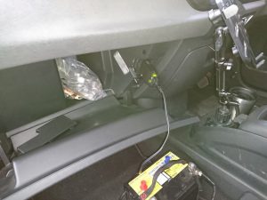 最初に、グローブボックス内のOBDⅡコネクターからバックアップ電源に繋いでおきます。