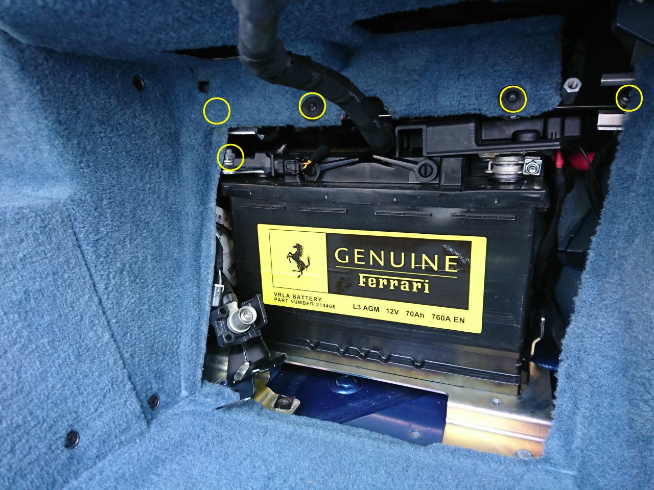 バッテリー搭載場所は、助手席足元のこのカバーを外したところにあります。360から430、458まで、V8モデルのバッテリーの搭載位置は同じです。このカバーも、一応工具無し(レバーを回すだけ)で開けられますが、このタイプの458のバッテリー交換作業をするには、一旦取り外した方が無難かと思います。