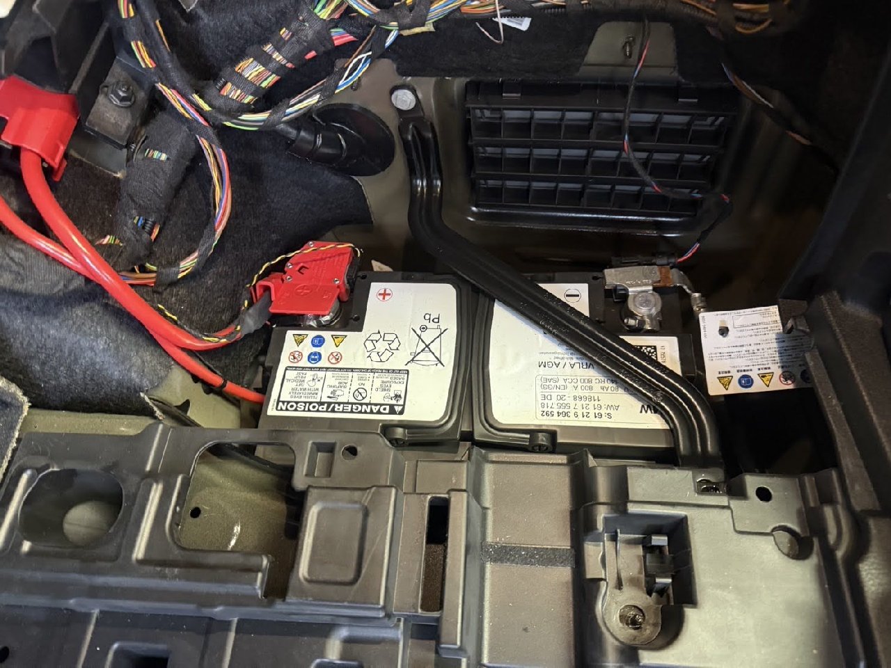 F30では、バッテリー搭載位置、場所はトランクを開けて右リヤフェンダー内にあります。歴代の3シリーズと同様です。フックを解除してカバーごと取り外しておきます。