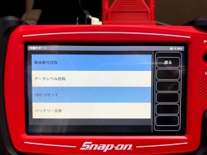 バッテリー交換作業終了後に、キーオン(エンジンは始動させない)OBDⅡからスキャナーツールであるスナップオンのMTG5000を繋ぎます。診断メニューからBMWソフトを立ち上げ車種を自動選択しますと、ECUからE60の525iであることが読み込まれます。