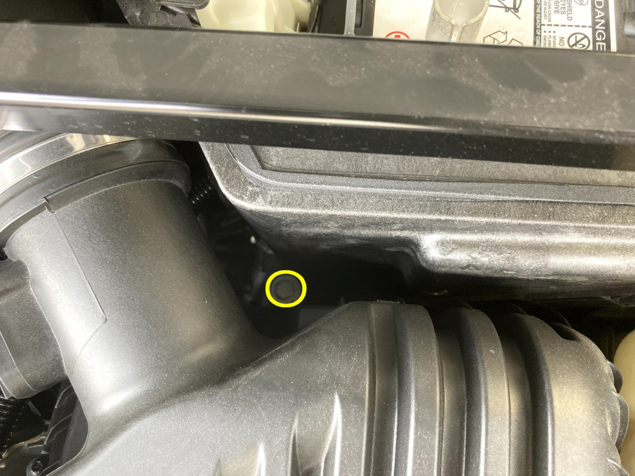 バッテリー本体の場所、位置は、ストラットタワーバー下のジャンピング用の赤いターミナル下になります。カバー類はもちろんですが、バッテリー本体を手前方向に引き抜く必要がありますので、エアクリーナーボックス、エアインテークも一旦取り外す必要があります。