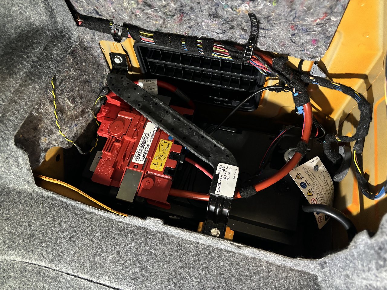 過去記事でもご案内の通り、この型のBMWでは当店ではエンジンルーム内のジャンピング用の端子からバックアップ電源に繋いでおきます。