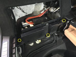 サブバッテリーはエンジンルーム内のこの場場所、位置に搭載されていますので2か所のボルトを外してカバーを開けておきます。