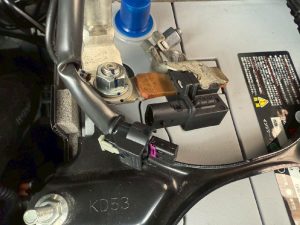 バッテリー本体のマイナスターミナルと電流センサーの作業をします。