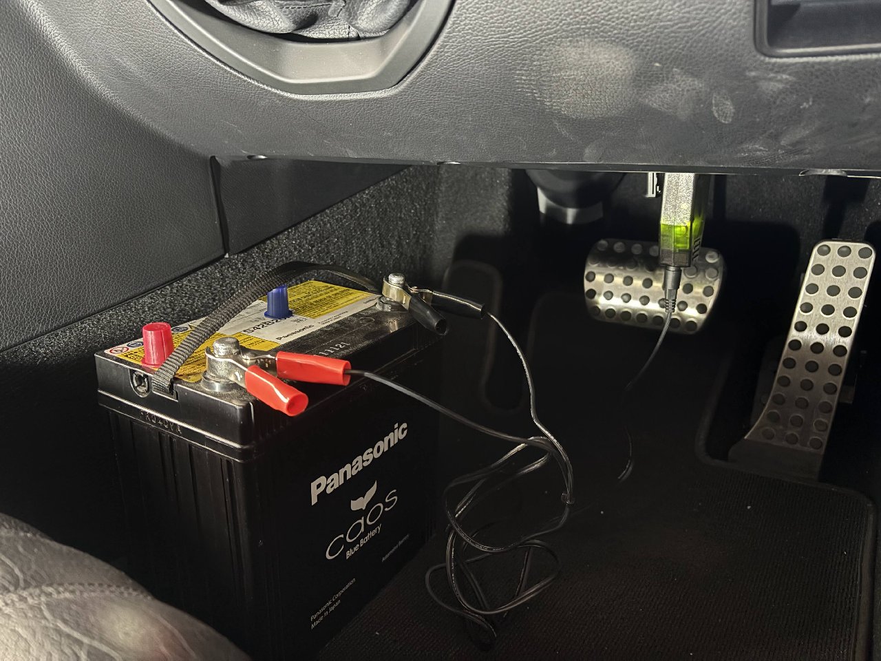 最初に、いつものように運転席足元のOBDⅡカプラーからバックアップ電源に繋いでおきます。
