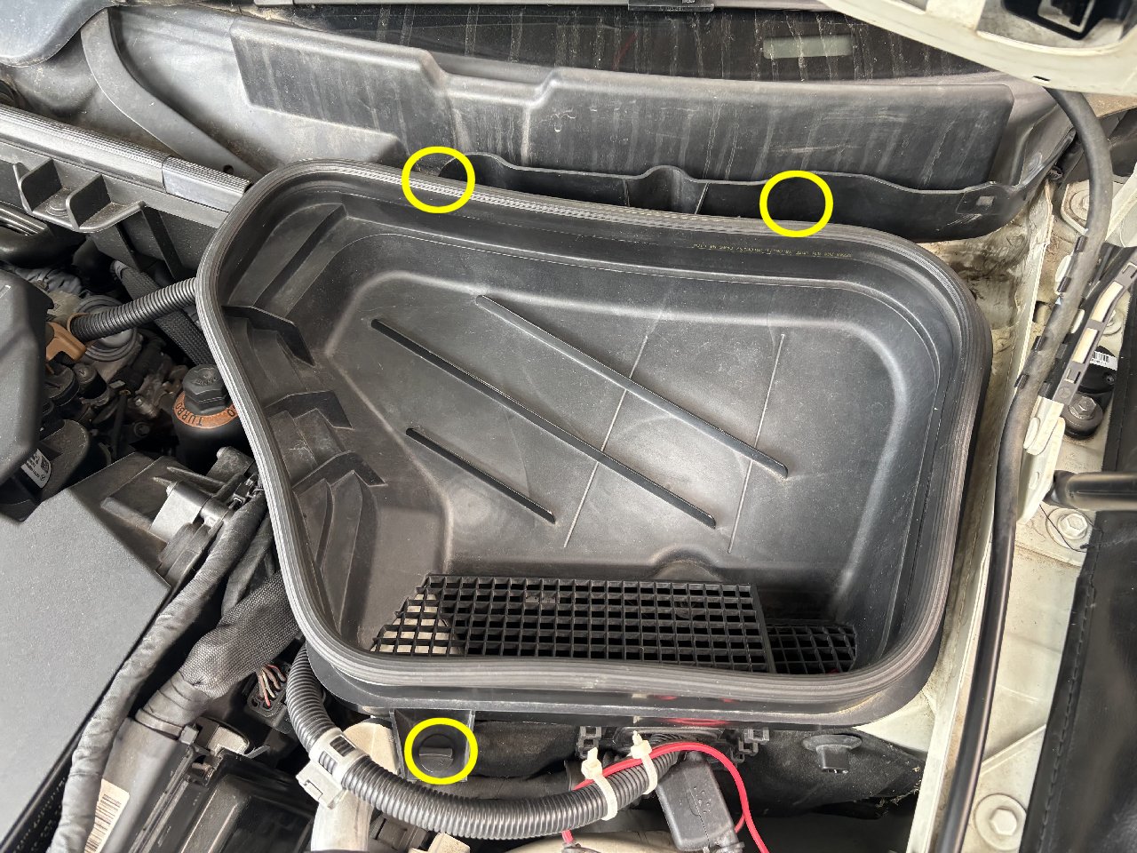 バッテリー本体はエンジンルーム内のこのカバー下に搭載されますのでカバーを取り外しておきます。